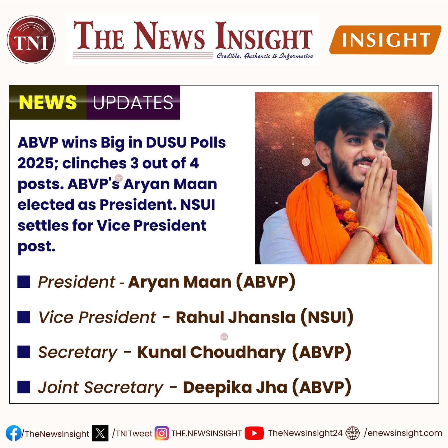 ABVP’s Aryan Maan defeated NSUI’s Joselyn to get elected as President. ABVP won President, Secretary and Joint Secretary posts. NSUI settles for Vice President post.