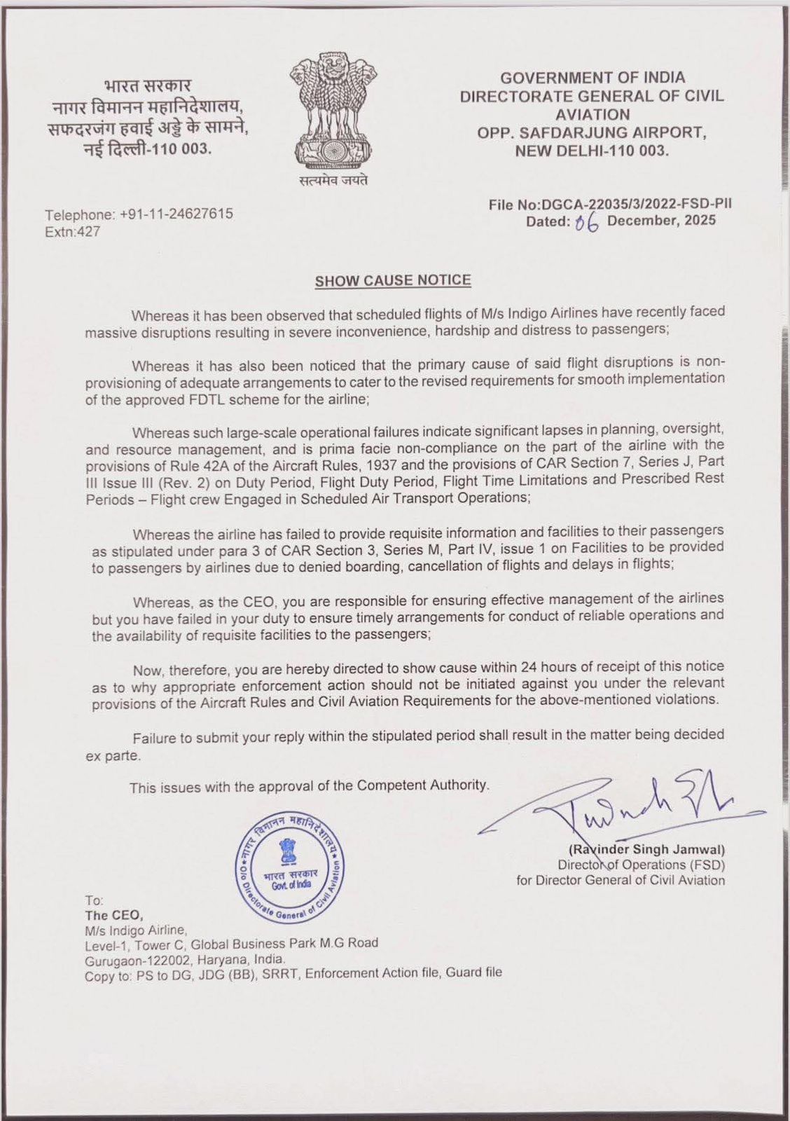 According to the notice, the airline did not make sufficient arrangements to meet updated crew fatigue rules and also failed to ensure essential facilities for passengers during widespread delays and cancellations. The DGCA warned that if Elbers does not respond by Sunday evening, the matter will be decided without his input.