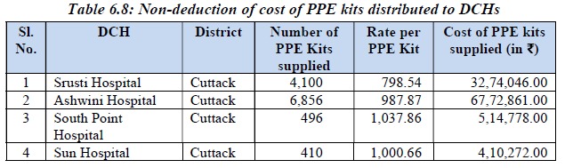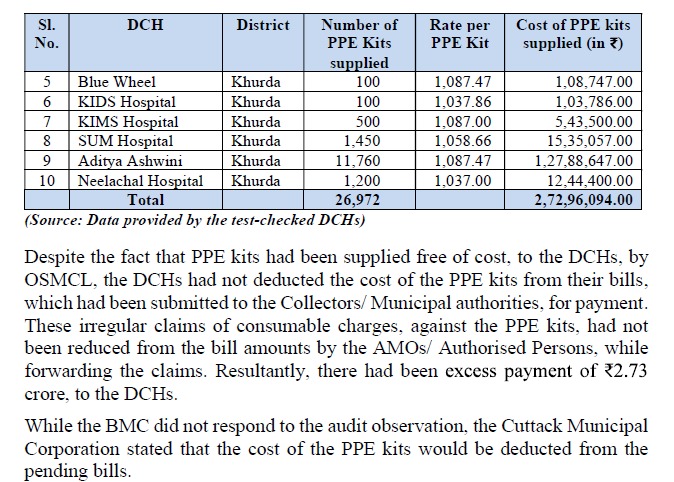 Another significant irregularity involved the non-deduction of costs for PPE kits supplied by the government to hospitals free of charge. Ashwini Hospital in Cuttack was the highest beneficiary in this category, with ₹67.72 lakh worth of PPE kits unadjusted in its bills. SUM Hospital, Aditya Ashwini Hospital, and several others in Khurda district were also involved, with the total excess payment for PPE kits reaching ₹2.73 crore. Despite being provided these kits by the Odisha State Medical Corporation Limited (OSMCL) free of cost, hospitals included their costs in bills submitted for payment, resulting in further misappropriation of funds. The Cuttack Municipal Corporation acknowledged these observations and stated that the cost of PPE kits would be deducted from pending bills.