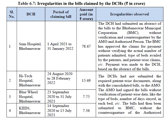 Among the findings, eight private hospitals received ₹144.88 crore without proper scrutiny of their claims. SUM Hospital in Bhubaneswar, in particular, was found to have the highest financial irregularity, receiving ₹78.67 crore between April 2021 and January 2022. These payments were made without any verification or countersignature by authorized medical officials or the Bhubaneswar Municipal Corporation (BMC). The claims were approved based on abstract bills rather than detailed documentation, severely undermining accountability. Hi-Tech Hospital, also in Bhubaneswar, received ₹15.69 crore during August 2020 to February 2022 without submitting patient-wise documentation. Similarly, Blue Wheel Hospital and KIIDS in Bhubaneswar received payments of ₹7.75 crore and ₹7.36 crore, respectively, without adequate scrutiny of their claims.