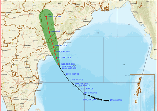 📌The Severe Cyclonic Storm moved north-northwestwards and lay about 100 km south-southeast of Machilipatnam, 180km south-southeast of Kakinada, 270 km south-southwest of Visakhapatnam and 500 km south-southwest of Gopalpur.