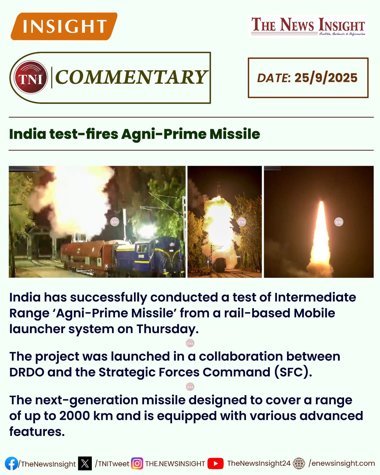 India test-fire ‘Agni-Prime Missile’ By Sagarika Satapathy Published: Sep 25, 2025 2:47 pm Share India has successfully conducted a test of Intermediate Range ‘Agni-Prime Missile’ from a rail-based Mobile launcher system on Thursday. Support Independent Journalism? Keep us live. Agni-Prime MissileDRDOIndiaStrategic Forces Command Share FacebookTwitterWhatsApp