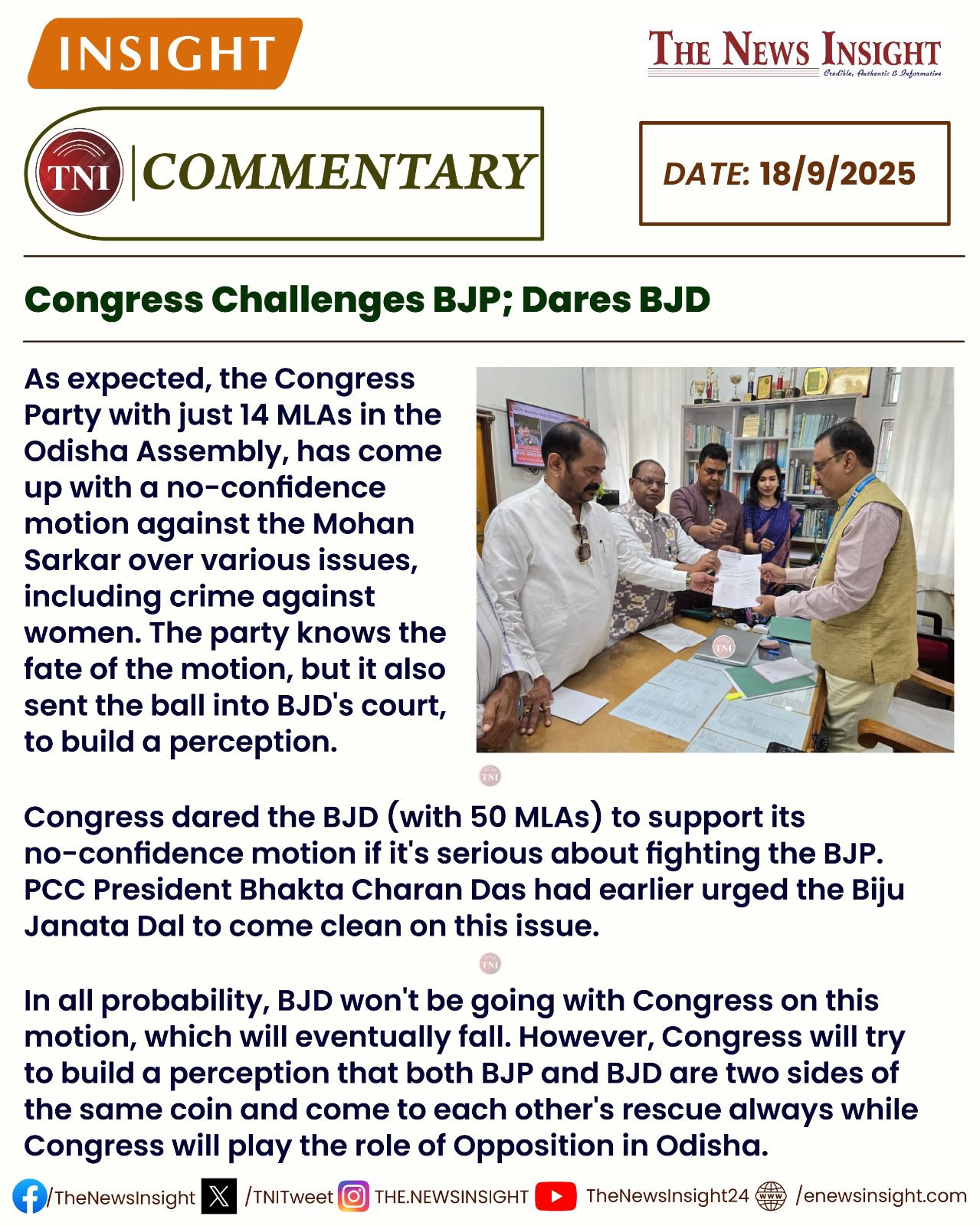 TNI Commentary – Congress challenges BJP; Dares BJD By Sagarika Satapathy Published: Sep 18, 2025 7:27 pm Share 14 Congress MLAs today moved a no confidence motion against CM Mohan Charan Majhi led Odisha Government. Support Independent Journalism? Keep us live. BJDBJPCongressOdisha PoliticsTNI Commentary Share FacebookTwitterWhatsApp