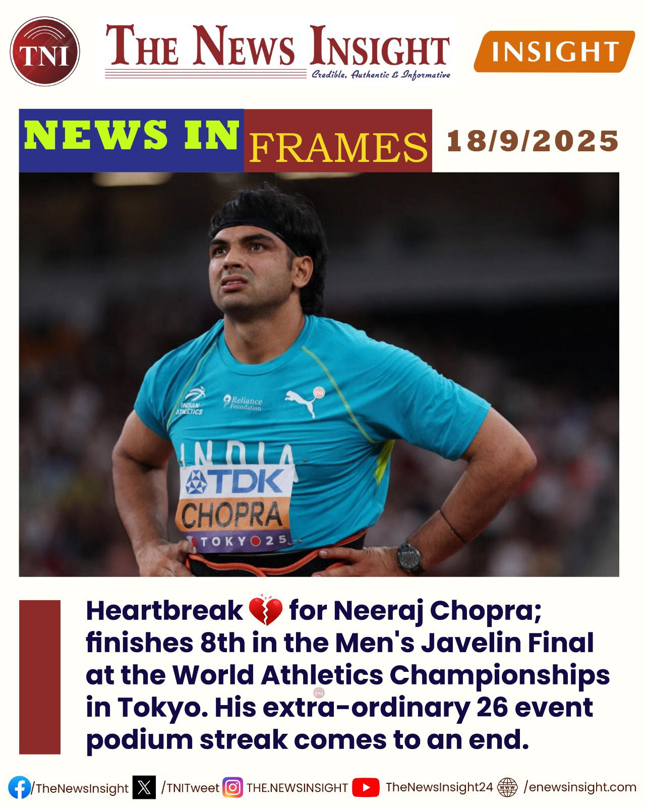 TNI Sports – Heartbreak for Neeraj Chopra By Sagarika Satapathy Published: Sep 18, 2025 9:54 pm Share Heartbreak for Neeraj Chopra as he finished eighth at World Athletics Championships. Support Independent Journalism? Keep us live. Neeraj ChopraOdishaTNI SportsWorld Athletics Championships Share FacebookTwitterWhatsApp