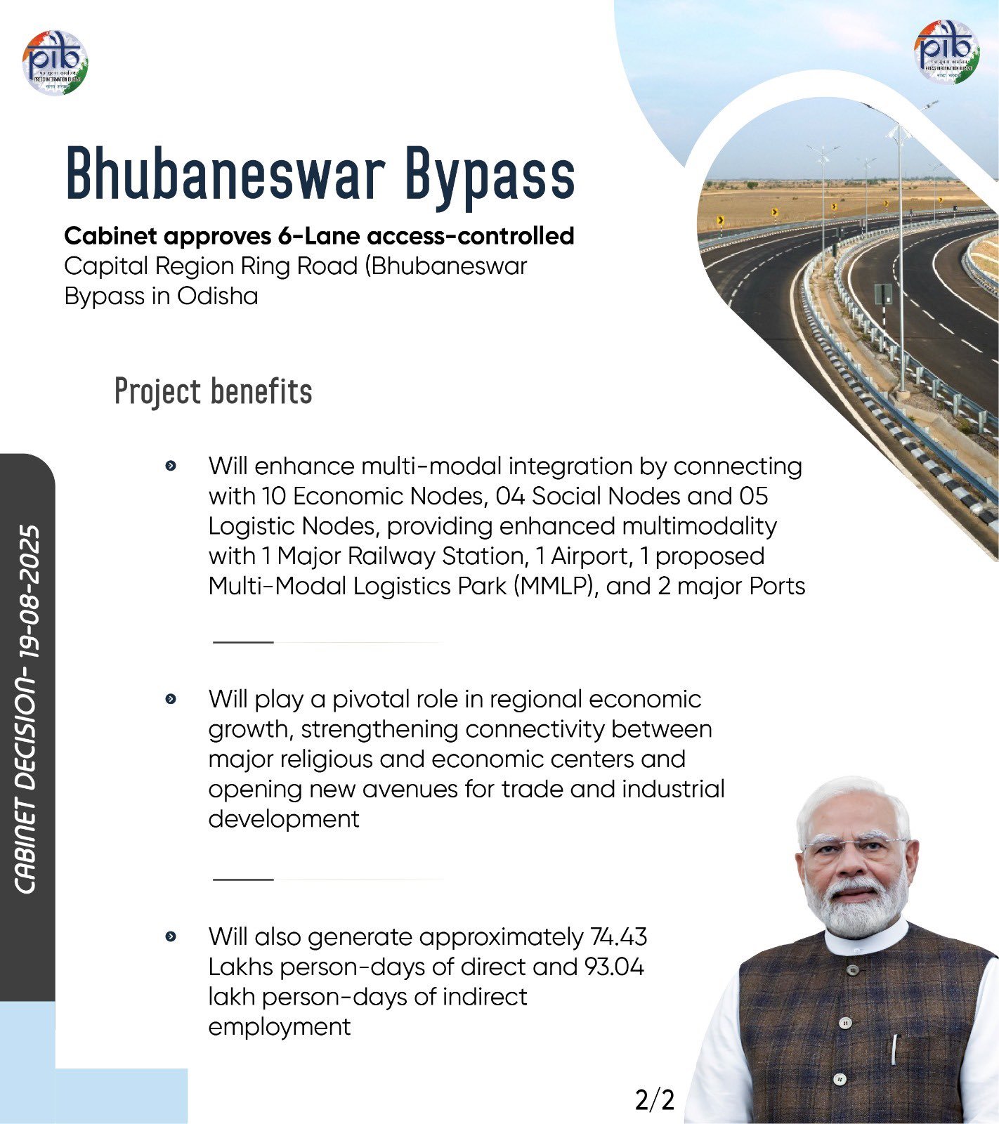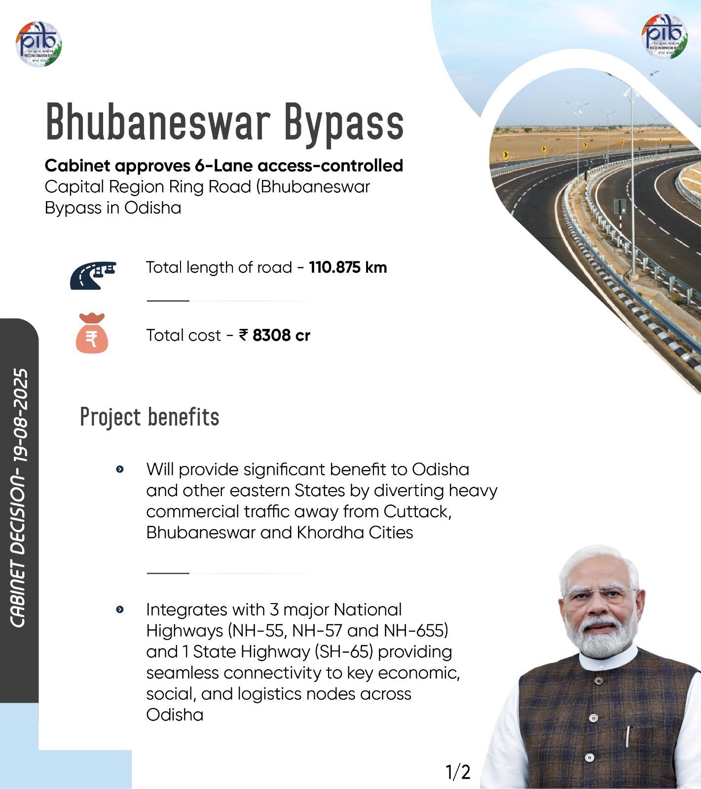 TNI Bureau: The Cabinet Committee on Economic Affairs has approved the construction of 6-Lane Access-Controlled Capital Region Ring Road (Bhubaneswar Bypass – 110.875 km) in Odisha on Hybrid Annuity Mode (HAM) at a total capital cost of Rs 8307.74 crore.